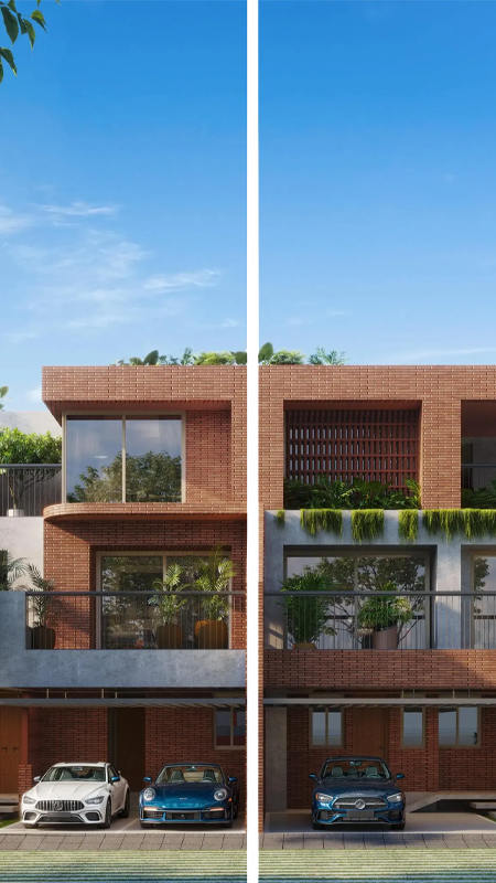 Only Grade-A materials are used, including premium steel and cement brands. The villas feature exposed brickwork, natural stone finishes, and strict quality control standards.