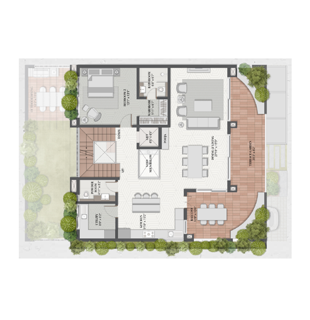 The project offers exclusive 4 BHK villas ranging from 3,700 to 4,000 sq. ft. of built-up area, featuring private gardens, double-height ceilings, and spacious decks.